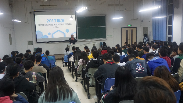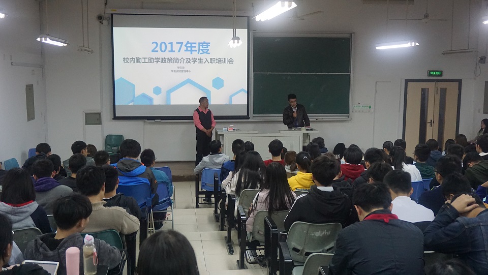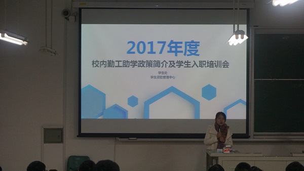 2017年11月23日晚,2017-2018学年勤工助学政策介绍及学生岗前培训在8302教室举行,会议由学生处学生资助管理中心王锡林老师主持,一百八十位校内新上岗学生参加了岗前培训。