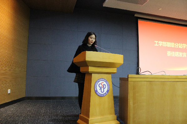 工学部朋辈分站的学生代表蔡佳萌,从一名新站长的角度,提倡朋辈的成员们要注重给予细小的温暖,用润物细无声的方式产生良好的心理影响,并且表明朋辈分站的建立将爱心、真心、责任心融入进来,朋辈分站会再接再厉配合总站完成工作,共同建设美好心理校园。