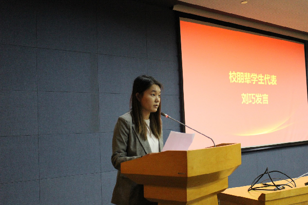 首先,校朋辈成长联盟的学生代表刘巧发言,她总结了2017-2018学年朋辈举办的一系列活动的心得与收获,并以新一届朋辈主席的身份表达了对未来一年朋辈工作方向和工作重点的思考,需更加有方向、有针对、有效率的开展互助工作。