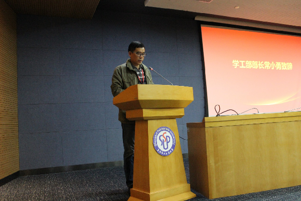 之后,学工部部长常小勇老师致辞。常老师首先对朋辈建立分站表示热烈祝贺,他表示十年来朋辈在大学生心理健康教育工作方面做出了重要贡献,朋辈是大学生心理健康重要的抓手之一,并对朋辈提出四点希望:创新工作方式、深入学习心理知识并做好宣传、成为心理健康模范、利用分站开展心理健康活动。