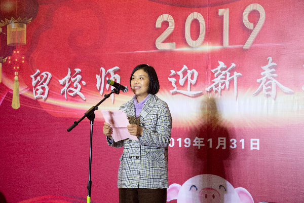 毛丽娟向师生们致以新春的祝福和节日的问候。她在致辞中表示,刚刚过去的2018年是改革开放40周年,召开了全国教育大会,国家发展和教育事业展现了新面貌。上海第二工业大学主动对接上海市“高原高峰学科”战略和社会经济发展需求,积极推进和创新大学生思想政治教育和质量文化建设,在课程思政、教学改革、国际交流等方面形成了发展特色和品牌亮点。