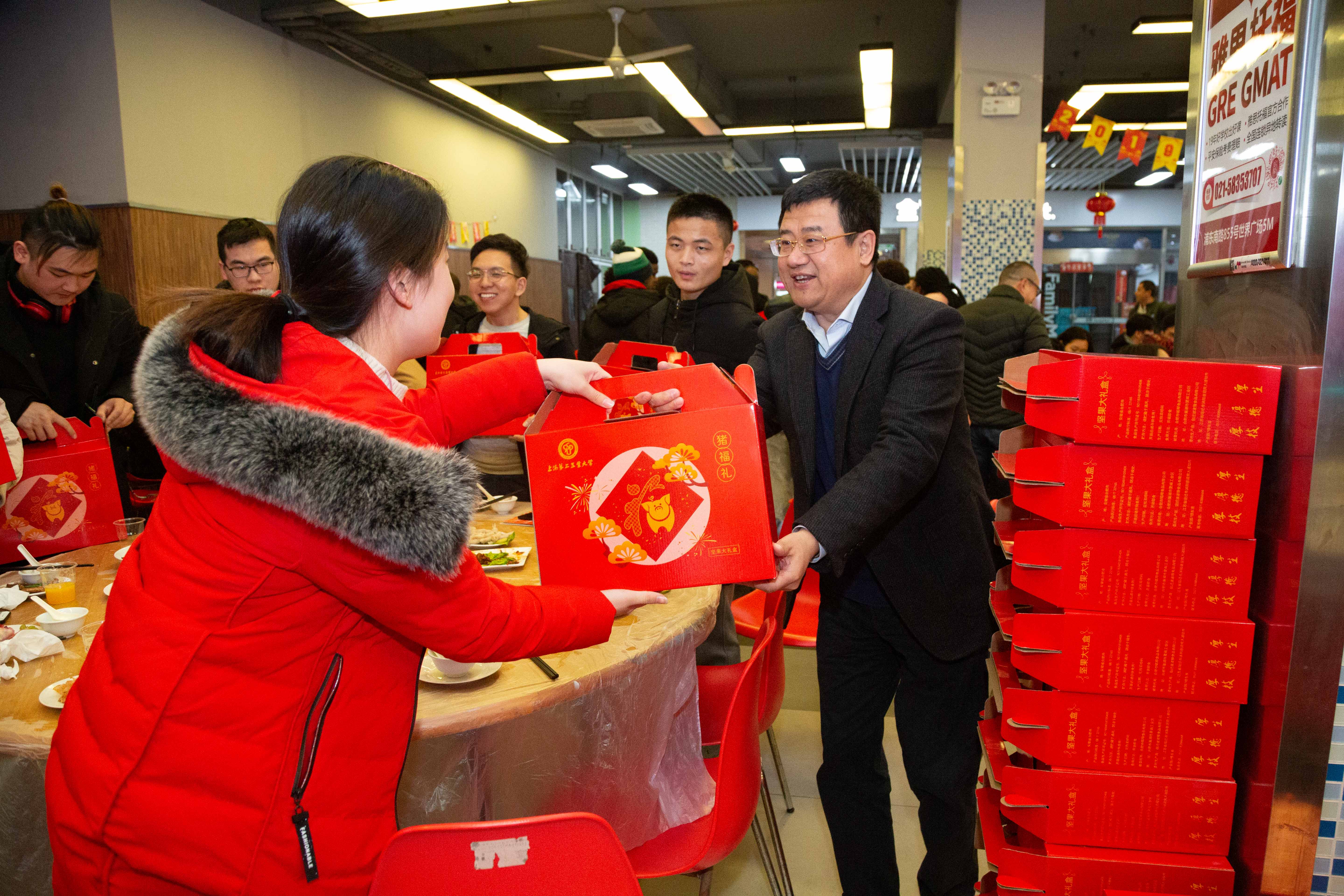 1月31日晚,我校东一食堂暖意洋洋,市教委副主任毛丽娟,市教委学生处副处长吴能武,校领导宋宝儒、俞涛、莫亮金等与240余名留校本专科生、研究生和留学生欢聚一堂,同吃年夜饭,共迎新春佳节的到来。相关职能部门负责人、辅导员代表一起参加了联欢会。