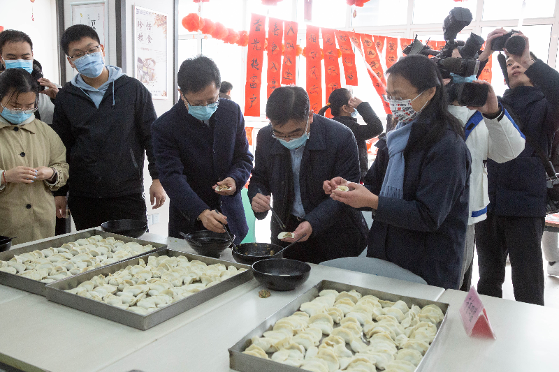 校领导与留校学生一同包饺子时,亲切询问同学们的学习、考研复习、实习等学习和生活安排,亲切叮嘱同学们做好个人防疫保护,要取得优异成绩也要有健康的体魄,还要记得和家人多联系报平安,希望同学们能在学校共同度过一个温暖、充实、祥和的春节。