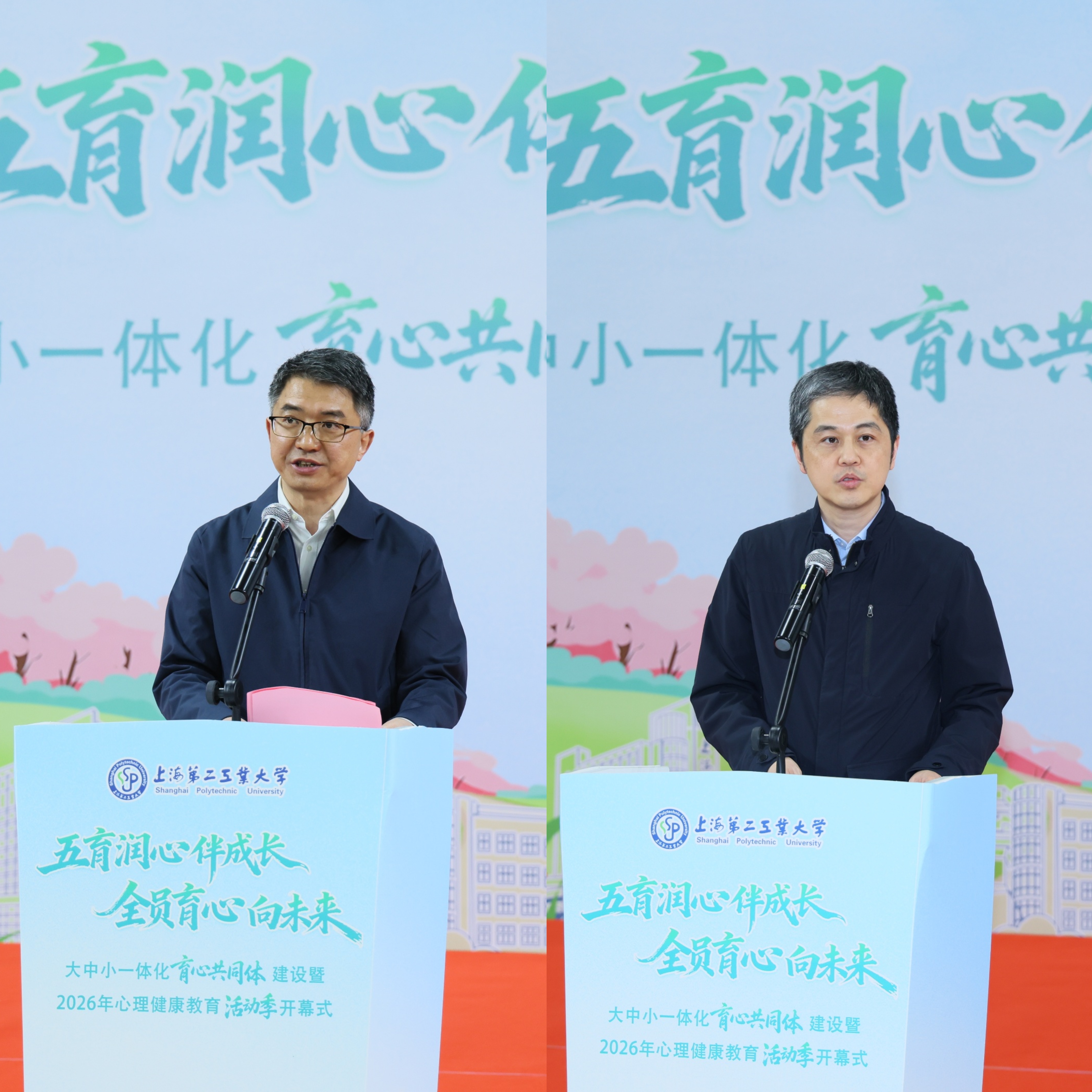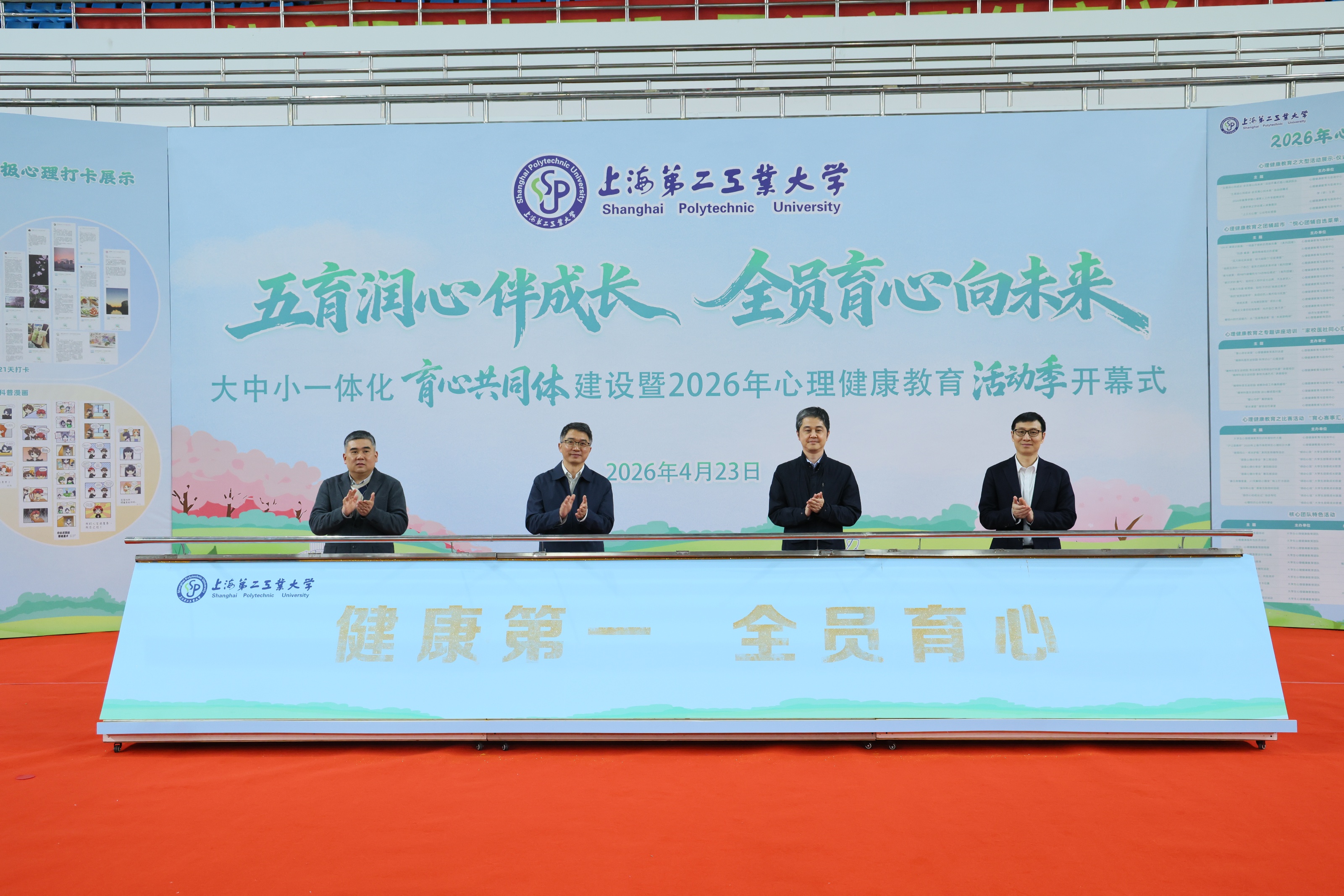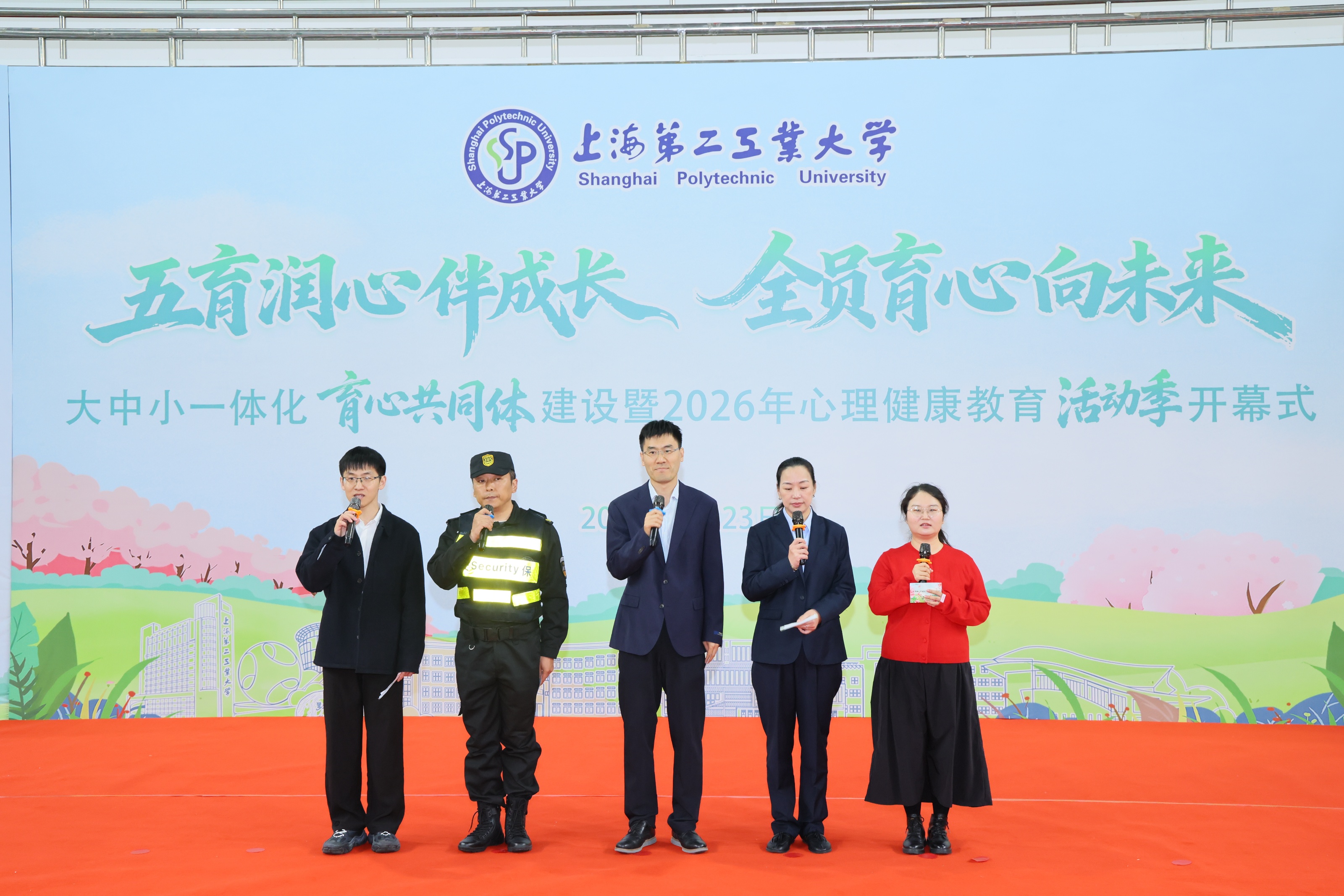 4月23日中午,上海第二工业大学大中小学一体化育心共同体建设暨2026年心理健康活动季开幕式在体育馆内举行。上海市教委德育处、上海市教育科学研究院德育发展研究院、杨浦区精神卫生中心、浦东新区精神卫生中心、上海市工业技术学校、上海市经济管理学校、上海市第二轻工业学校、附属龚路中学等单位领导,学校相关职能部门负责人、各学院分管学院副书记、教师代表、全体辅导员、学生代表等齐聚现场,共同参加本次活动。