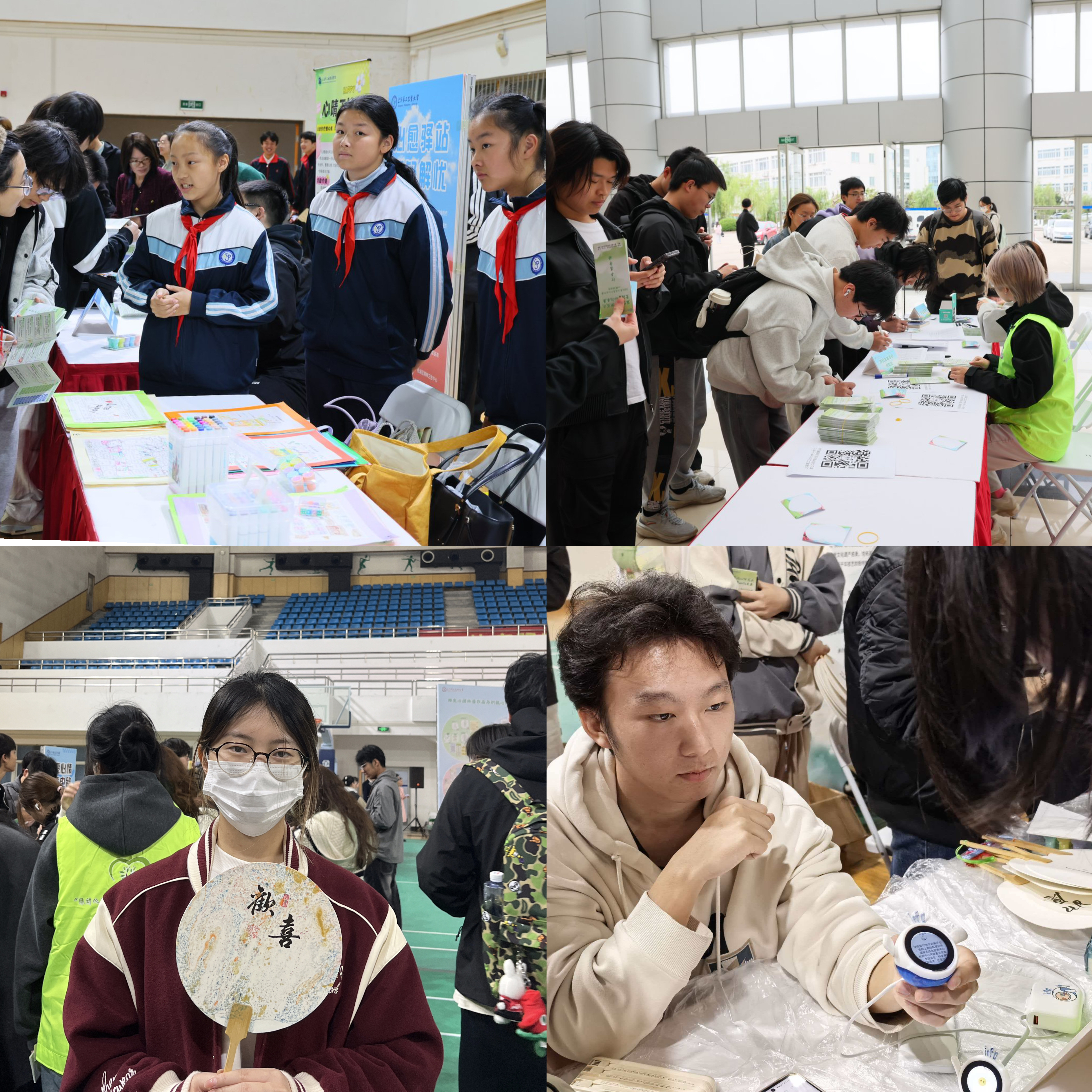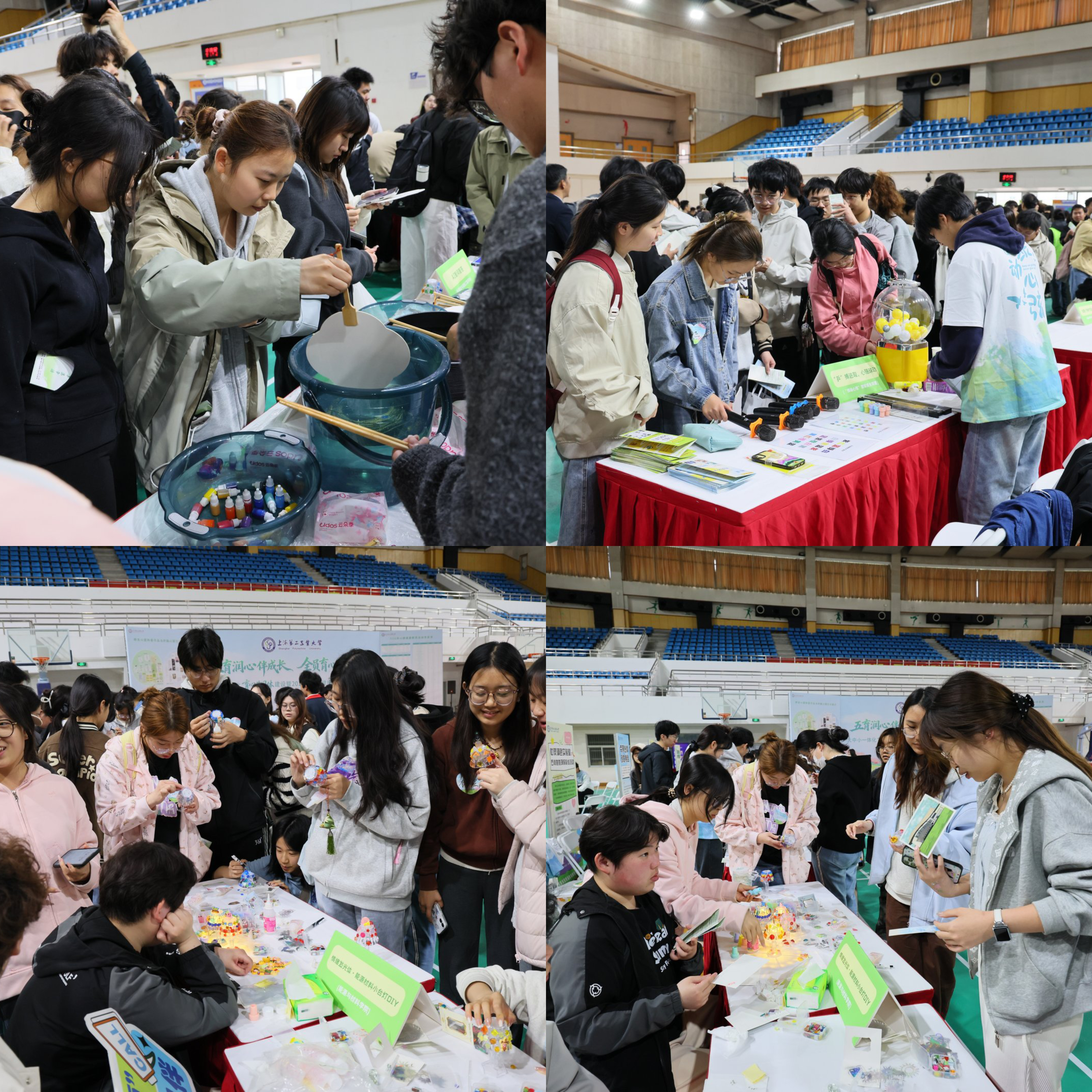 创意手作区通过动手劳动安放情绪,以劳健心。同学们领取纸电路材料包亲手点亮小灯;用环保颜料将心情涂上石膏娃娃;组装能源材料小台灯并投递心情明信片;在制作非遗漆艺扇子的过程中感受匠心手作带来的治愈力量;用五彩豆子拼贴进入正念状态;从情绪色卡中选色彩完成面部彩绘;在马克莱姆编织中感受“心流”状态。